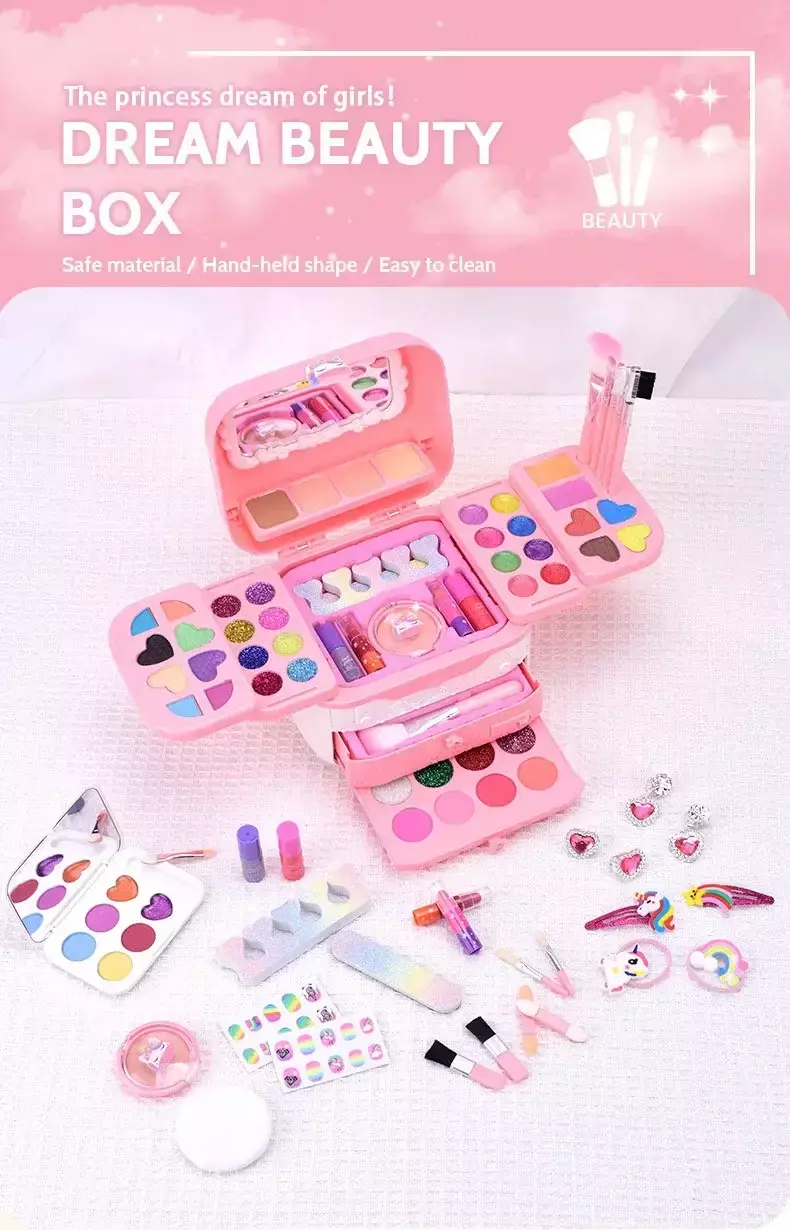Composto por 72 peças incríveis, incluindo sombras, batons, brilhos, esmaltes, pinceis e acessórios, este kit é perfeito para transformar a hora da brincadeira em pura diversão com segurança. 💜