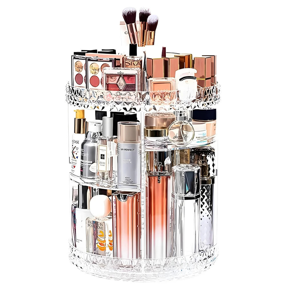 Transforme sua penteadeira em um espaço organizado e elegante com o Organizador Giratório 360° em Acrílico.